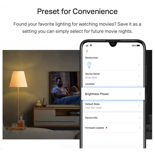 - Stmívatelná (nastavení pro vaše pohodlí) – Našli jste své oblíbené osvětlení pro sledování filmů? Uložte jej jako nastavení, které si můžete jednoduše vybrat pro budoucí filmové noci.