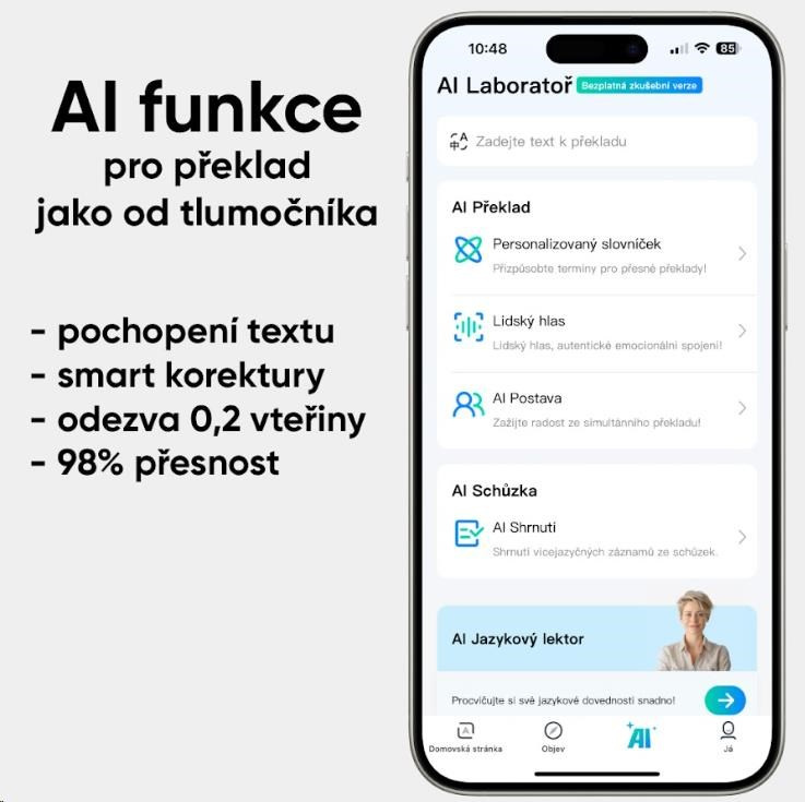 Překonejte jazykové bariéry v reálném čase s AI tlumočníkem a překladatelem Timekettle W4. Podporuje obousměrný překlad ve 42 jazycích a 95 dialektech, takže konverzace mezi různými kulturami je plynulá a přirozená. Ať už cestujete, pracujete nebo poznáváte nové lidi, W4 zajistí, že každé slovo bude správně pochopeno. Rozlučte se s trapnými pauzami a jazykovými nedorozuměními – stačí mluvit a AI se postará o zbytek. Komunikujte svobodně a sebevědomě kdekoliv na světě bez jazykových omezení. Přesnost překladu je až 98% a AI slovník na principu velkých jazykových modelů (LLM) zajistí díky perfektnímu porozumění přesnou opravu podobně znějících slov a celkovému porozumění kontextu konverzace. Aplikace Timekettle vám navíc z konverzací vytvoří přepis a AI shrnutí.