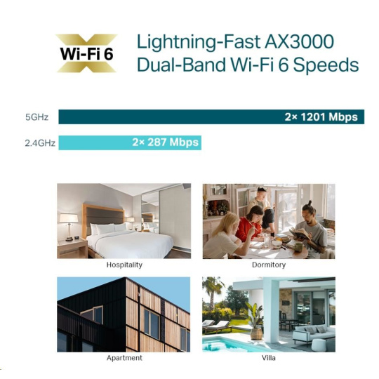 - Bleskurychlé přenosové rychlosti AX3000 Wi-Fi 6: Simultánní rychlosti 574 Mbit/s v pásmu 2,4 GHz a 2 402 Mbit/s v pásmu 5 GHz poskytují výslednou přenosovou rychlost 2 976 Mbit/s v síti Wi-Fi.