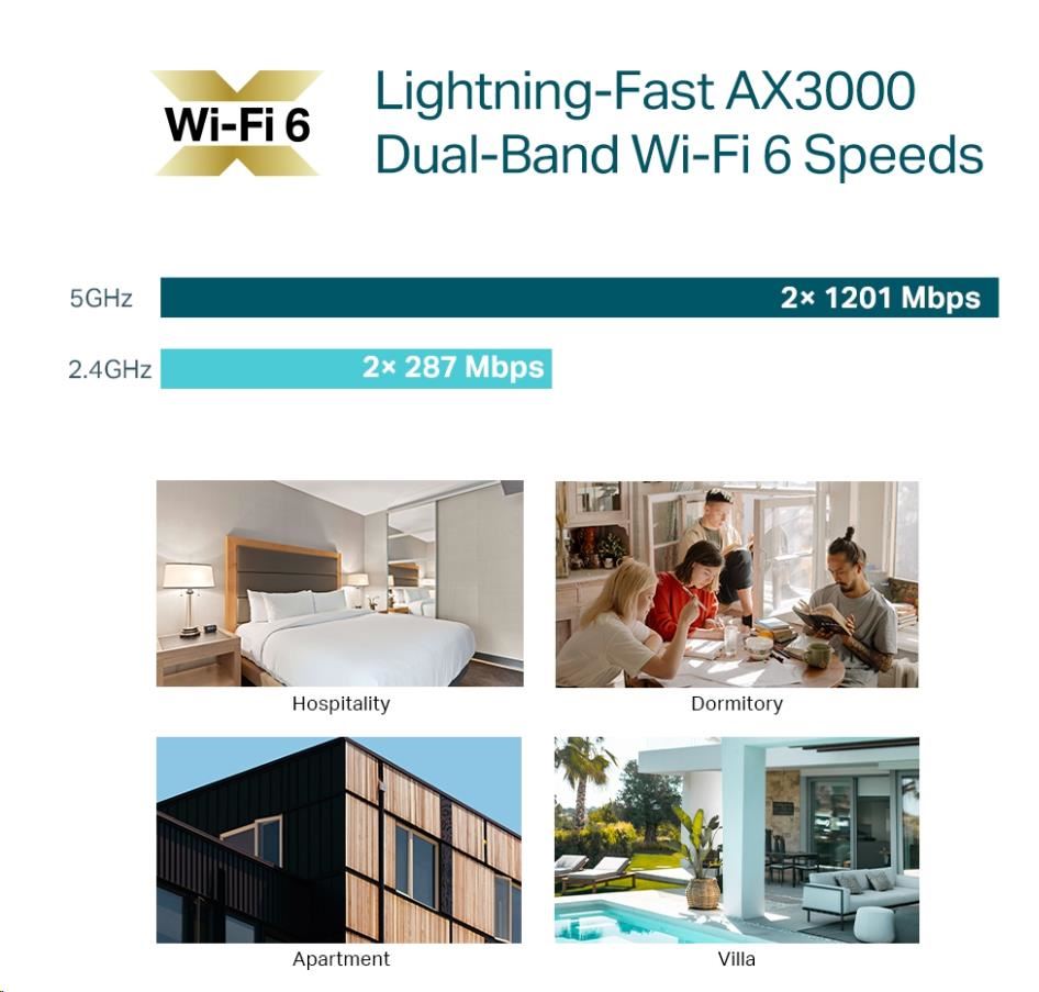 - Bleskurychlé přenosové rychlosti AX3000 Wi-Fi 6: Simultánní rychlosti 574 Mbit/s v pásmu 2,4 GHz a 2 402 Mbit/s v pásmu 5 GHz poskytují výslednou přenosovou rychlost 2 976 Mbit/s v síti Wi-Fi.