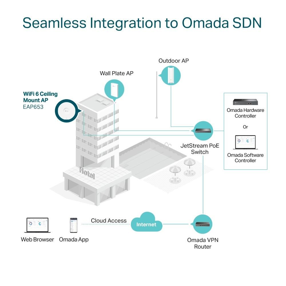 • Centralizovaná cloudová správa - díky integraci do platformy Omada SDN můžete celou síť spravovat lokálně nebo přes cloud prostřednictvím webového rozhraní nebo aplikace Omada.