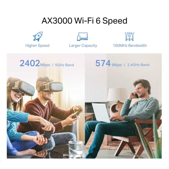 - Dvoupásmová síť Wi-Fi 6 - oddělená pásma 5 GHz (2 402 Mbit/s) a 2,4 GHz (574 Mbit/s) sítě Wi-Fi přinášejí díky nejnovějším technologiím vyšší rychlost a větší propustnost.