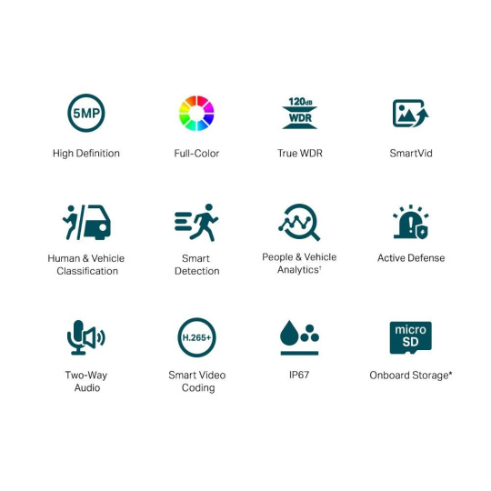 - Smart Video Enhancement: Profesionální technologie VIGI zpracovávají videa tak, aby výrazně zlepšily jejich kvalitu, která je zásadní pro vaše monitorování, včetně Smart IR, True WDR, 3D DNR a Night Vision.