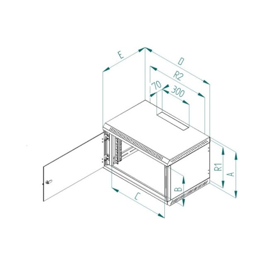 Přesné rozměry a další technické údaje jsou uvedeny níže (hodnoty R1 a R2 označují rozteče montážních otvorů pro zavěšení rozvaděče na zeď). Maximální zatížení rozvaděče je 30 kg
