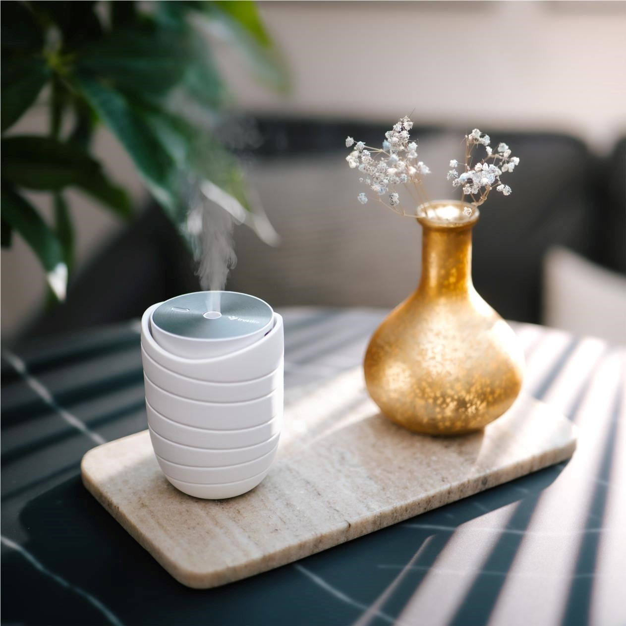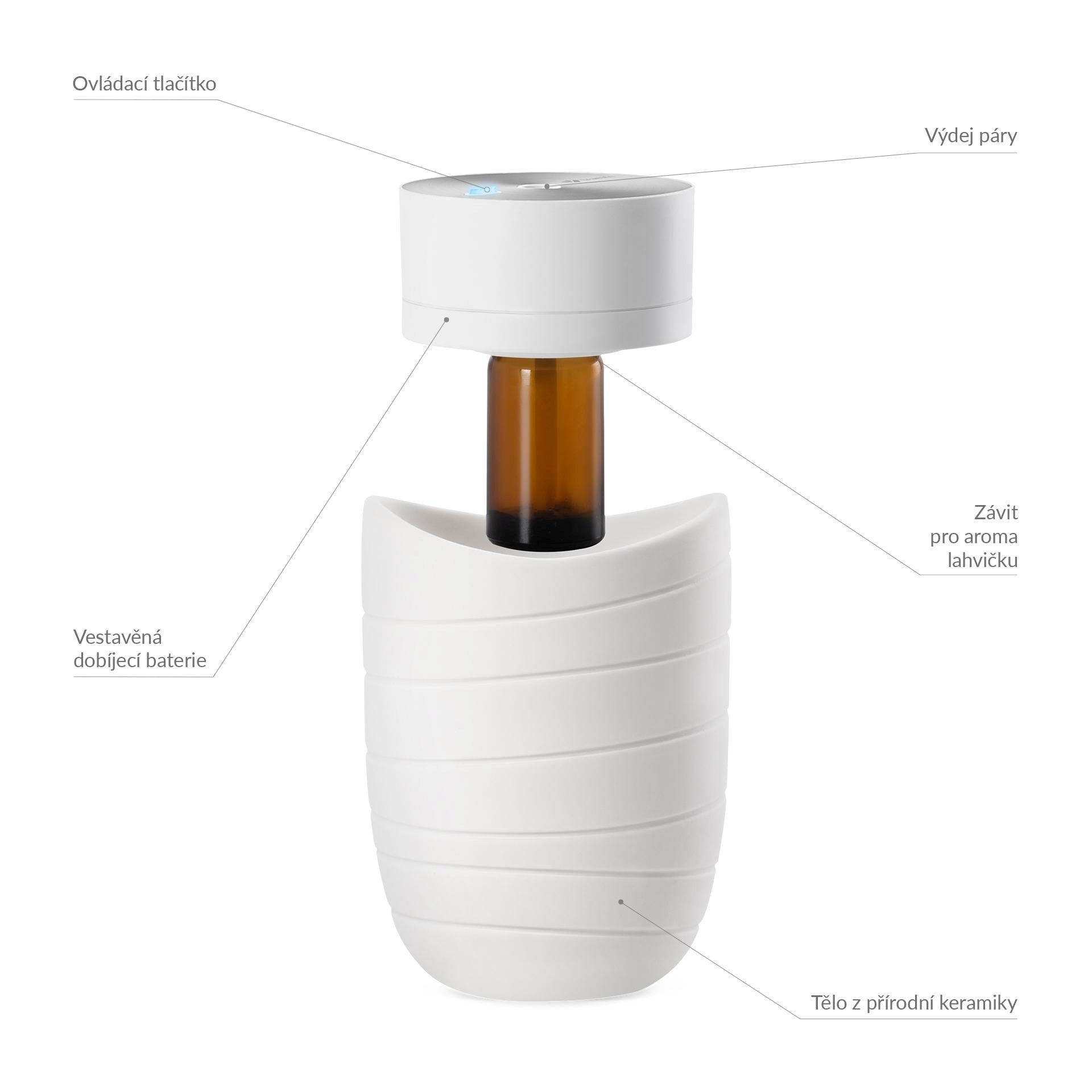 Difuzér díky jeho kompaktním rozměrům můžete snadno přenášet a užívat si tak benefitů aromaterapie doma i v práci, a to dlouhé hodiny. Baterie v závislosti na použitém režimu vydrží 23, 16 nebo 12 hodina jakmile poklesne její kapacita, difuzér vás upozorní a poté se vypne. Dobíjení probíhá přes USB-C přímo v těle difuzéru. Každý interiér difuzér nejen provoní, ale také ozdobí svým designem a přírodním tělem vyrobeným z keramiky.