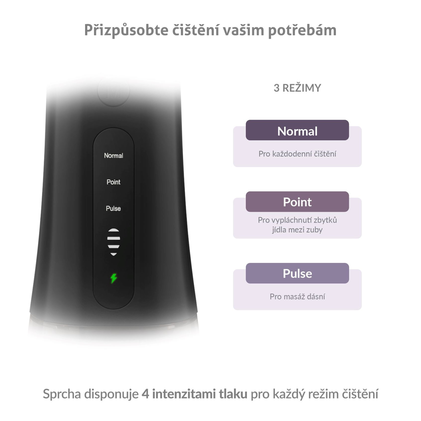 Sprcha nabízí 3 režimy čištění s různými intenzitami tlaku (30 – 130 PSI), včetně režimu POINT, který cíleně a účinně odstraní zbytky jídla z mezizubních prostor.