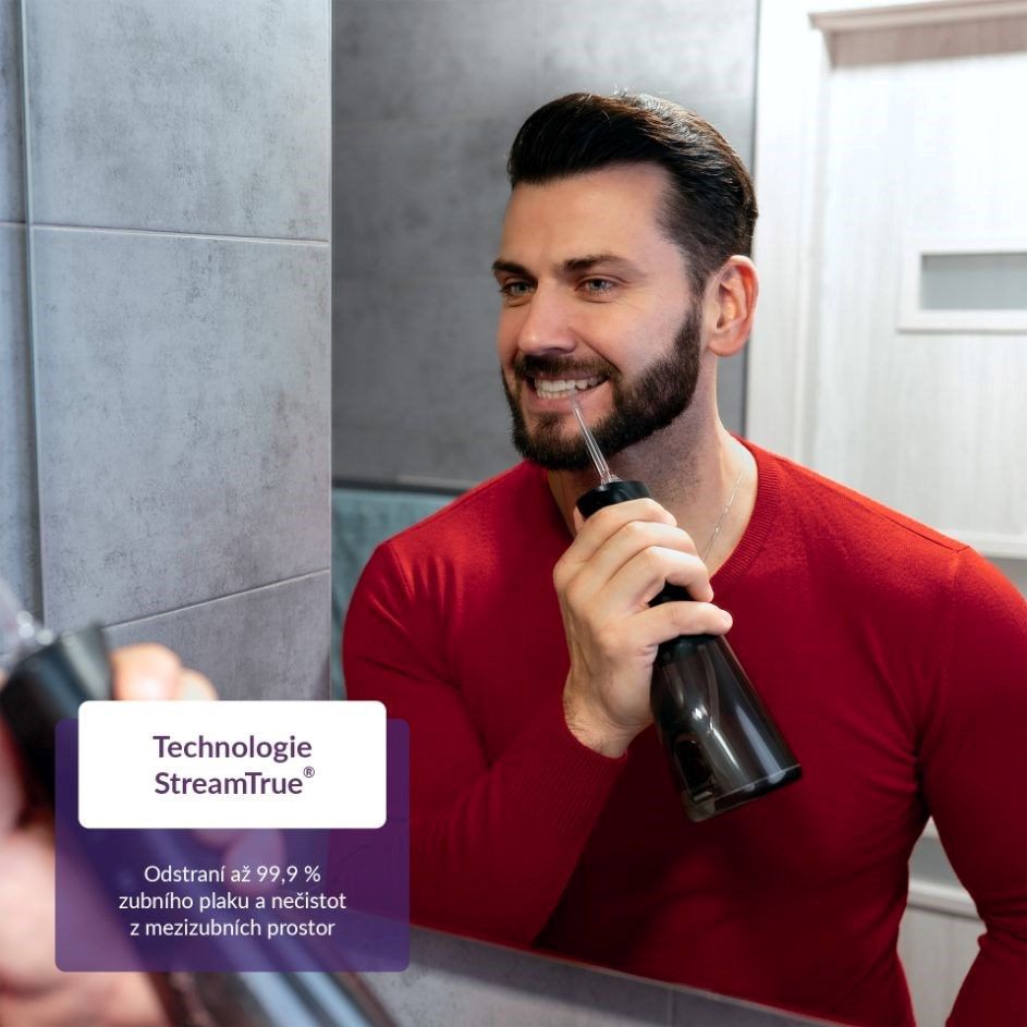 Mezizubní prostory bývají rájem bakterií, které jsou příčinou zubních kazů. Nejúčinněji se jich zbavíme každodenním čištěním nejen zubů, ale právě i prostoru mezi nimi. Speciální kartáčky či zubní nitě nemusejí být zrovna komfortní a jejich neustálé nakupování pociťuje naše peněženka. Šetrnější řešení ve všech směrech představuje ústní sprcha TrueLife AquaFloss Compact L100 Black disponující 3 režimy čištění, především režimem POINT, který cíleně a účinně odstraní zbytky jídla z mezizubních prostor. 300ml nádržka s dvojitým plněním, shora i z boku, pohodlně vystačí na dvouminutové čištění, které hlídá integrovaný časovač. Praktické je pak plnění nádržky shora větším otvorem, které je mnohem rychlejší a jednodušší než plnění menší dírkou z boku, kterou standardních ústních sprchy disponují. Díky tomu je celá příprava i používání ústní sprchy rychlejší a komfortnější. Dokonalou péči zajistí 6 trysek pro různé dentální potřeby, od klasického čištění přes čištění jazyka a odstranění plaku až po ortodontické či periodontální potřeby. Pro použití sprchy není třeba připojení do sítě, její baterie vydrží při užití 2x denně až 14 dní. Díky svému kompaktnímu řešení s vámi sprcha může i cestovat. Přehledný displej zobrazuje aktuální nastavení, funkce paměť zajišťuje, že se po zapnutí spustí naposledy použitý režim.