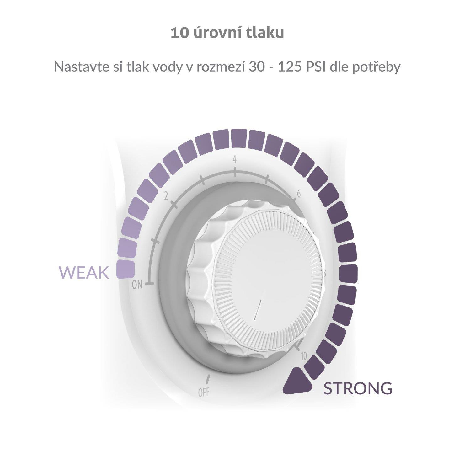 U AquaFloss Station S600 máte na výběr z deseti úrovní tlaku vody, v rozmezí 30-125 PSI, čištění zubů si tak můžete plně přizpůsobit. Požadovaný tlak si nastavíte pomocí kolečka na stanici. Součástí sprchy je 6 speciálních trysek (3× Standard, 1× Orthodontic, 1× Periodontal, 1× Dental Plaque), navržené pro různé potřeby: