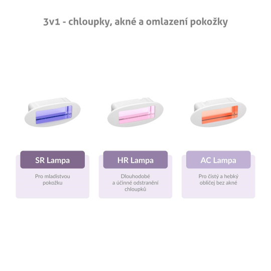 Epilátor TrueLife BELLE IPL EB5 využijete kromě samotné epilace i k dalším aplikacím. Stačí pouze vyměnit lampu. K dlouhodobému a účinnému odstranění chloupků vám poslouží HR lampa, Nejednoho člověka trápí akné. Pokud chce mít obličej čistý a hebký na dotek, doporučujeme použít AC lampu. Pokud chcete svoji pokožku omladit, pomůže vám s tím SR lampa. Všechny lampy jsou součástí balení. Nemusíte si tedy nic dokupovat. Určitě oceníte i praktický stojánek.