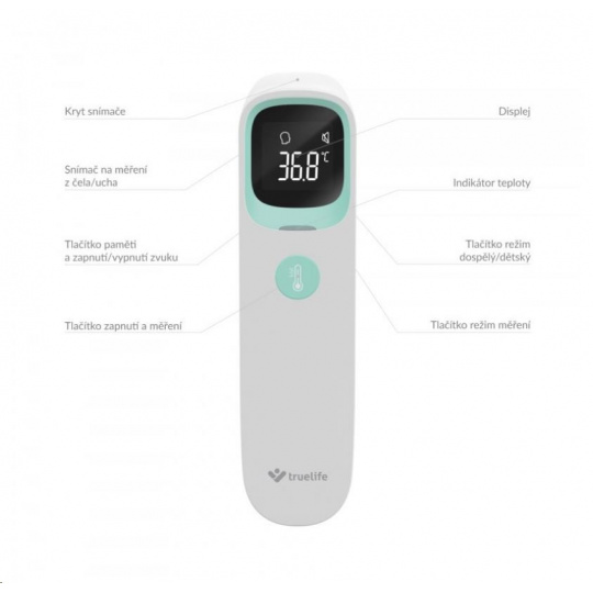 TrueLife Care Q10 BT nabízí tři režimy měření teploty. Kromě klasického měření tělesné teploty dokáže změřit i předměty, povrchy, nebo tekutiny. Snadno tak můžete zkontrolovat třeba kojeneckou stravu nebo čaj. U měření tělesné teploty osob máte možnost volby mezi měřením z teploty z ucha, nebo čela. Teploměr disponuje i dětským režimem, který je uzpůsoben pro osoby mladší 12 let.
