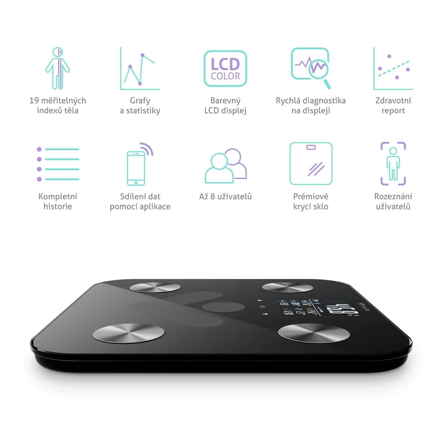 TrueLife FitScale W6 BT Black automaticky rozezná až 8 uživatelů, takže se s rodinou nebo přáteli můžete předhánět, kdo dosáhne lepších výsledků. Mnohem lépe to jde s mobilní aplikací, kterou si stáhnete kompletně v češtině a během chvíle znáte svůj kompletní reporting, údaje si porovnáte, projdete si statistiky a nastudujete popisy měřených indexů. Data pak můžete sdílet s aplikacemi Apple Health Kit, Fitbit a Google Fit. Dokonalá je rovněž možnost nastavení váhy pro vážení dětí a možnost nastavení notifikací a připomínek vážení.