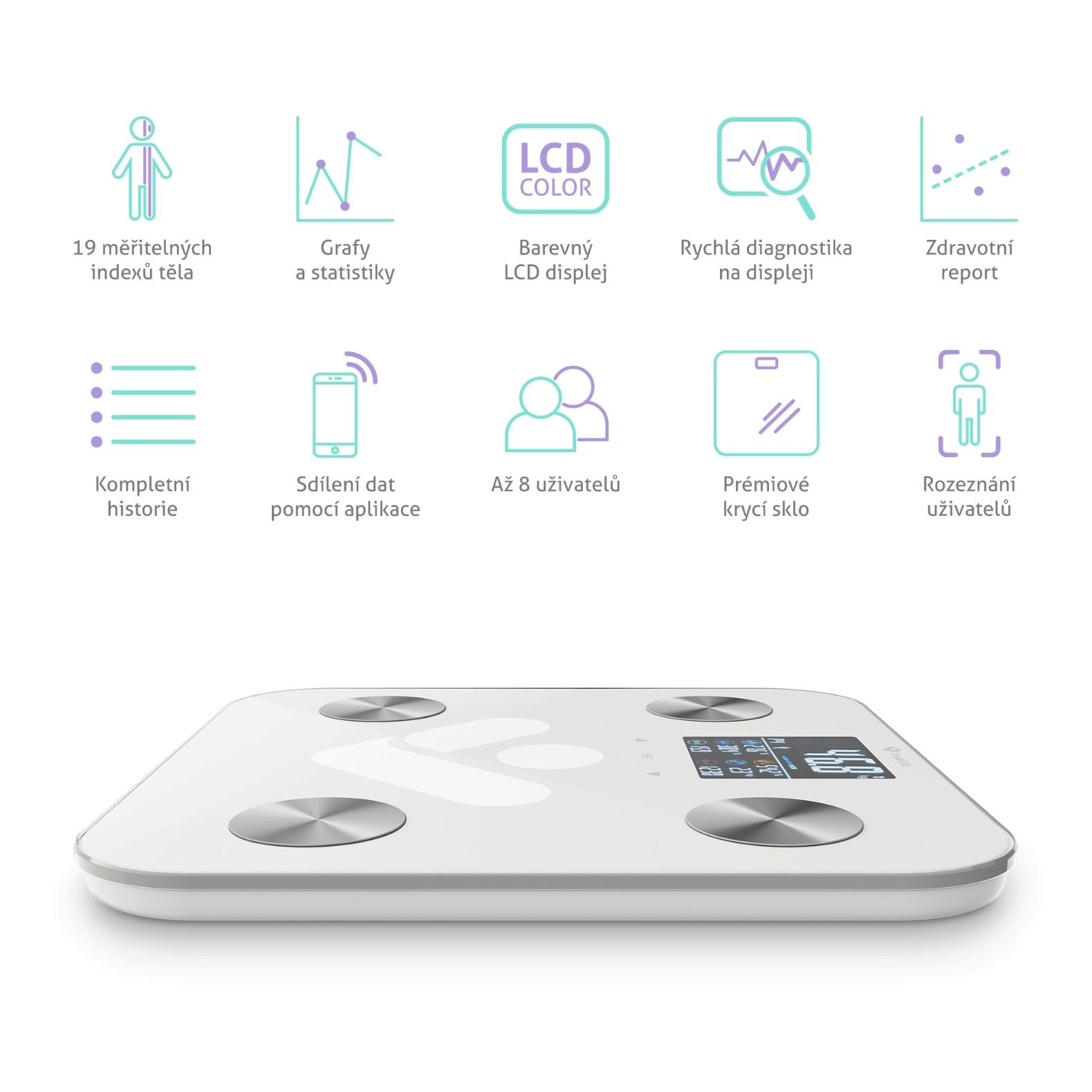 Váha umí automaticky rozpoznat až 8 uživatelů a zapamatovat si jejich údaje. Navzájem si tak mohou porovnávat výsledky a sledovat své pokroky.