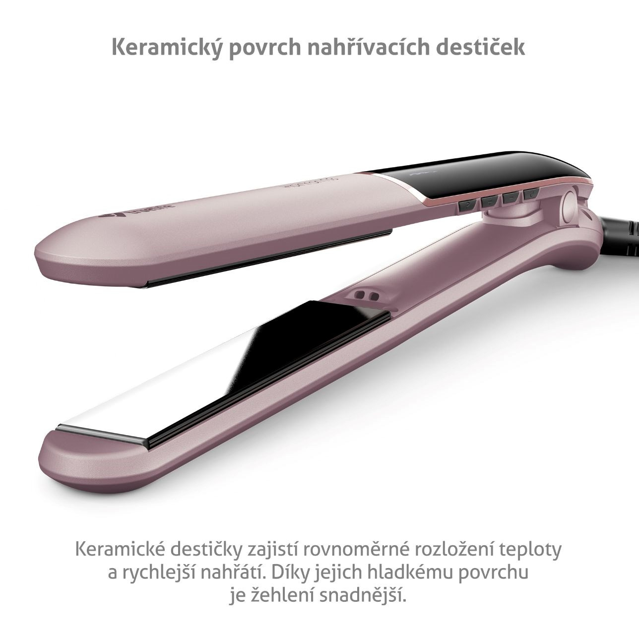 Nahřívací destičky žehličky jsou vyrobeny z keramiky, která se rychle nahřívá, zajišťuje rovnoměrné rozložení tepla, její hladký povrch usnadňuje žehlení, chrání vlasy a dodává jim lesk.