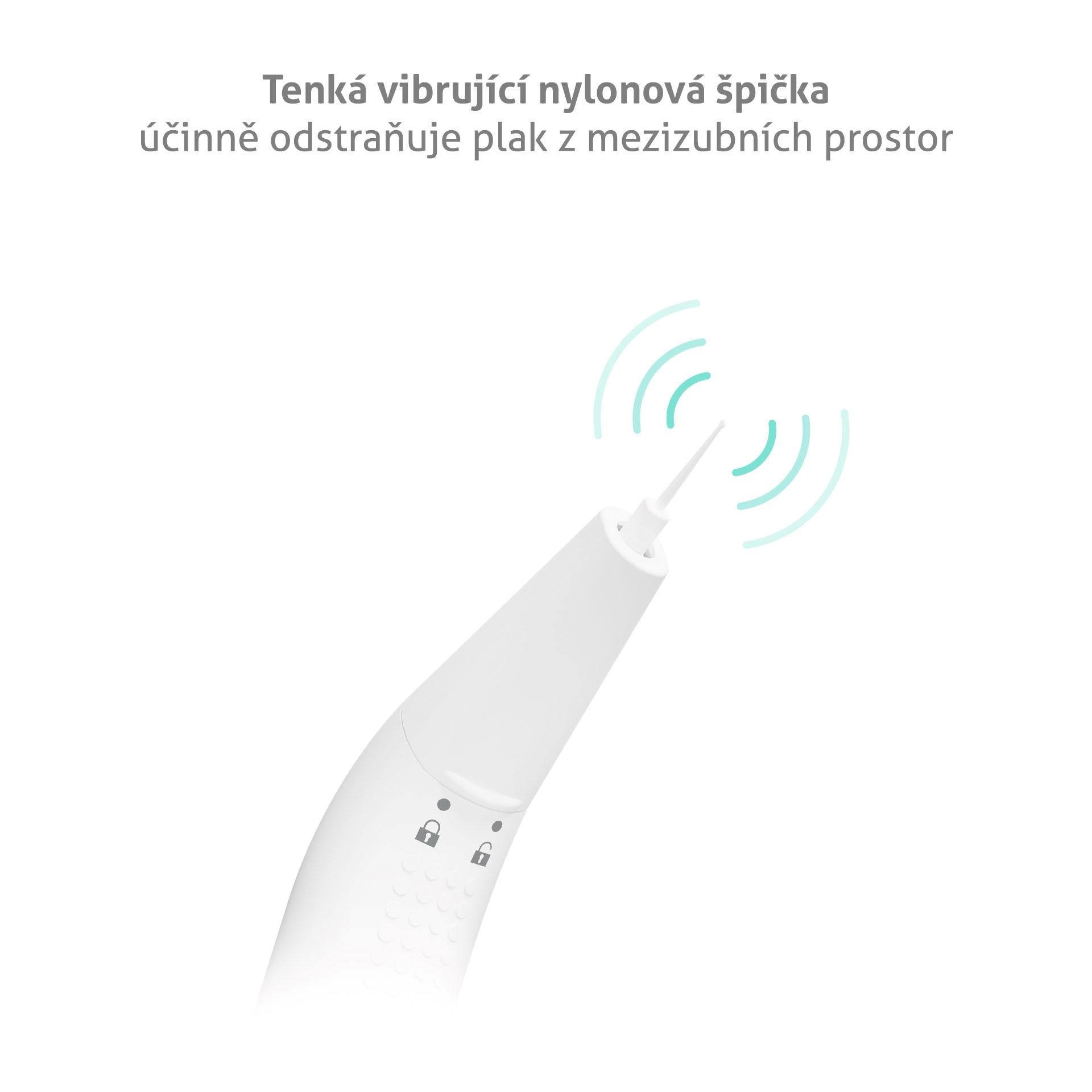 Tenká vibrující nylonová špička má na konci kuličku, která napomáhá vytáhnout šetrně zbytky jídla z mezizubních prostor.