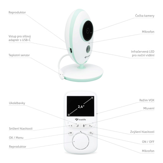 Oblíbená chůvička, ověřena zákazníky, TrueLife NannyCam V24 ve vylepšené verzi je tu. TrueLife NannyCam V24 Pro je digitální video chůvička s přehledným barevným 2,4 palcovým LCD displejem, pokojovým teploměrem, automatickým nočním módem a moderním USB-C připojením pro rychlé a spolehlivé nabíjení. Přenos zvuku i obrazu je vysoce kvalitní ve dne i v noci. Můžete být v klidu a mít jistotu, že je s Vašimi blízkými vše v pořádku, protože použitá digitální technologie s frekvencí 2.4 GHz zaručuje bezpečný a stabilní signál.