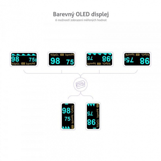 Oxymetr X3 disponuje přehledným OLED displejem, jehož nastavení lze přizpůsobit dle vašich preferencí. Na výběr je 6 možností zobrazení měřených hodnot. Nastavit můžete i preferovanou intenzitu jasu, zvukový indikátor, či zvukový doprovod tepu.
