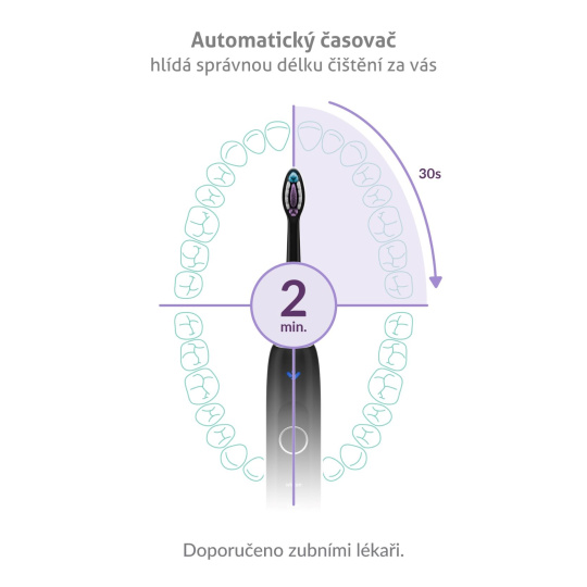 Zuby je ideální čistit po dobu 2 minut, což ohlídá automatický časovač. Navíc vždy po 30 vteřinách upozorní, že je potřeba přejít na čištění další části úst.