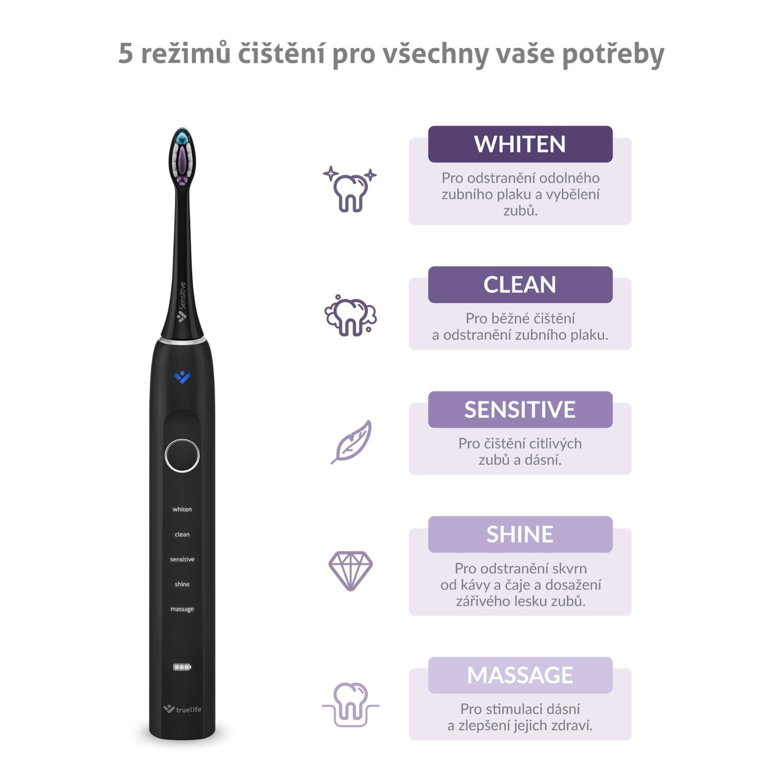 Stačí jediný kartáček pro vyřešení nejrůznějších obtíží. Balení sonického kartáčku TrueLife SonicBrush Clean70 UV zahrnuje 2 hlavice. Standard pro každodenní čištění a Sensitive s extra jemnými štětinkami pro citlivé zuby. Dokoupit lze i hlavici Whiten pro bělení zubů. Hlavice však nejsou jedinými pomocníky při péči o zuby a dásně, svou práci vykoná také 5 režimů čištění. S běžným čištěním si poradí režim Clean, o citlivé zuby a dásně se postará režim Sensitive, pro zářivý lesk a odstranění skvrn od čaje a kávy použijte režim Shine, o odstranění odolného zubního plaku a vybělení zubů se stará režim Whiten, chcete-li zlepšit zdraví dásní a stimulovat je, režim Massage je tím pravým.