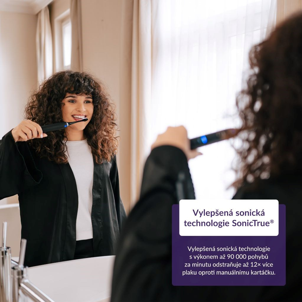 Díky vylepšené sonické technologii pracuje kartáček s dosud nejvyšším výkonem až 90 000 pohybů za minutu, díky čemuž odstraní až 12× více zubního plaku než manuální kartáček.
