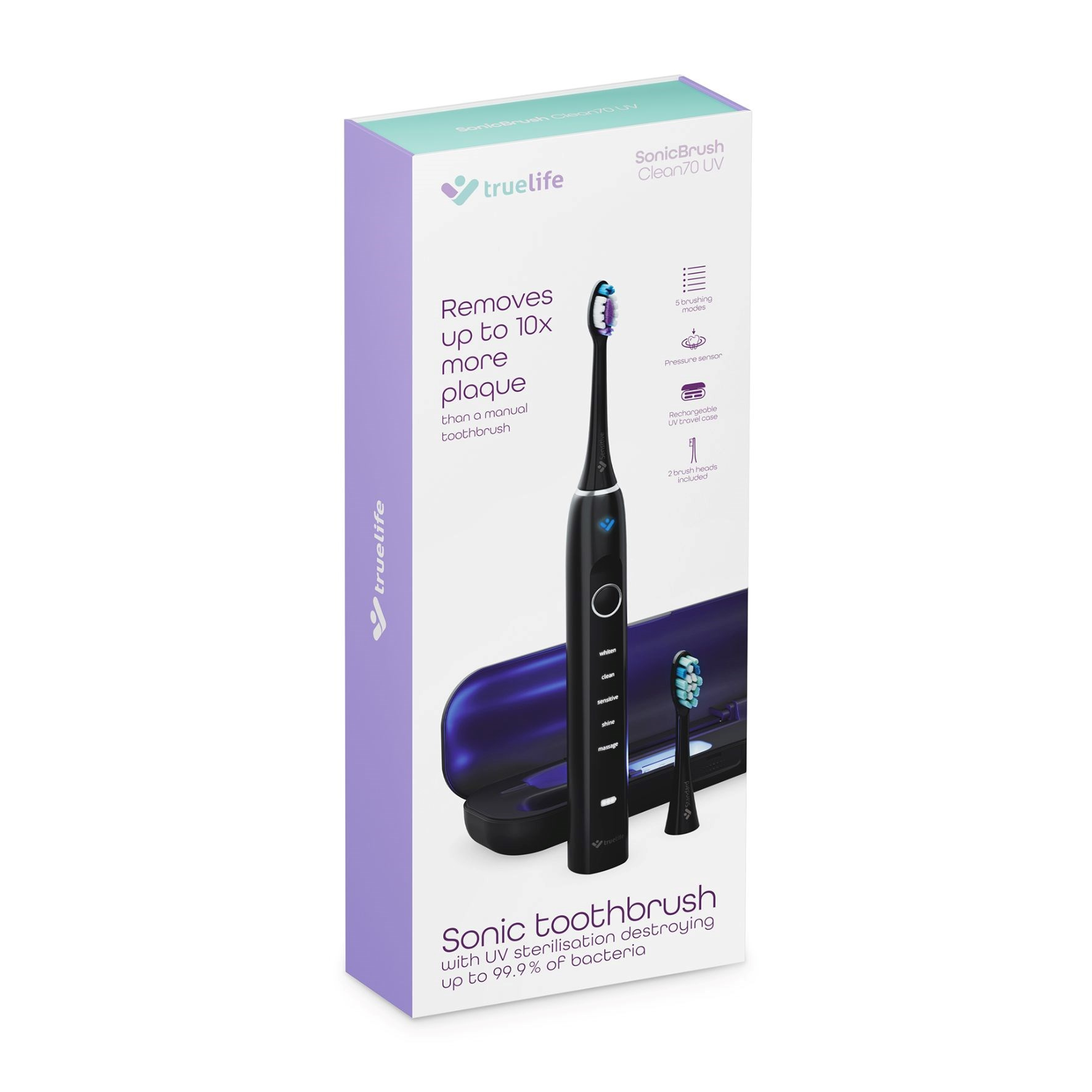 Chceme-li mít zdravé zuby a dásně, hygiena je zásadní. Sonický kartáček TrueLife SonicBrush Clean70 UV poskytuje nejen dokonalé čištění, ale také je vybaven dobíjecím pouzdrem s UV sterilizací. Stačí 5 minut k tomu, aby UV záření zničilo až 99,9 % bakterií a virů usazujících se na hlavicích zubních kartáčků. Sterilizace se spustí automaticky po vložení hlavice do pouzdra a časovač ohlídá její průběh. Pouzdro vydrží na jedno nabití až 17 dní při použití 2× denně.