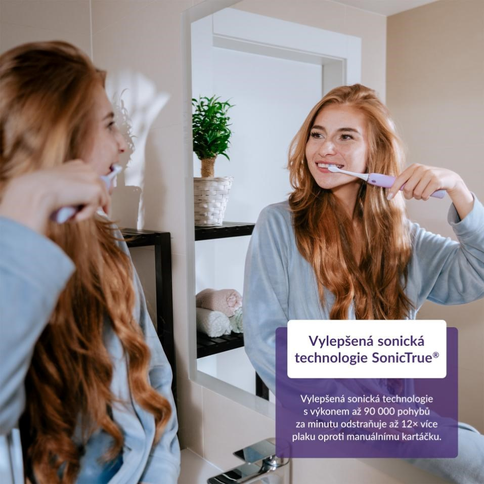 Díky vylepšené sonické technologii pracuje kartáček s dosud nejvyšším výkonem až 90 000 pohybů za minutu, díky čemuž odstraní až 12× více zubního plaku než manuální kartáček.