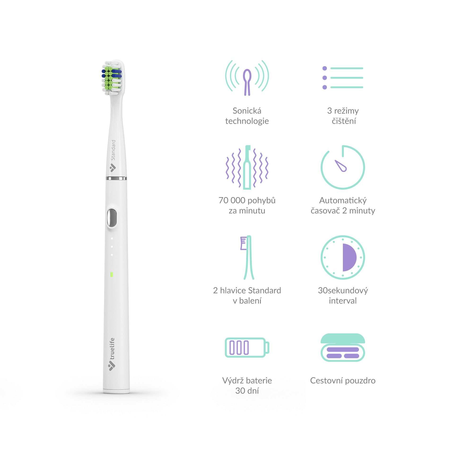 TrueLife SonicBrush Slim20 disponuje sonickou technologií SonicTrue ®, která efektivně a zároveň šetrně pomocí jemných vibrací bojuje proti zubnímu plaku. Hlava kartáčku kmitá rychlostí až 70 000 pohybů za minutu a vířením vody se zubní pastou dochází k čištění i mezizubních a hůře dostupných prostor. Balení obsahuje hned 2 čisticí hlavice, z nichž každá vydrží až 3 měsíce používání. Moment pro její výměnu indikují speciální modré štětiny, které postupně blednou. Máte tak jistotu, že se nesníží účinnost čištění.