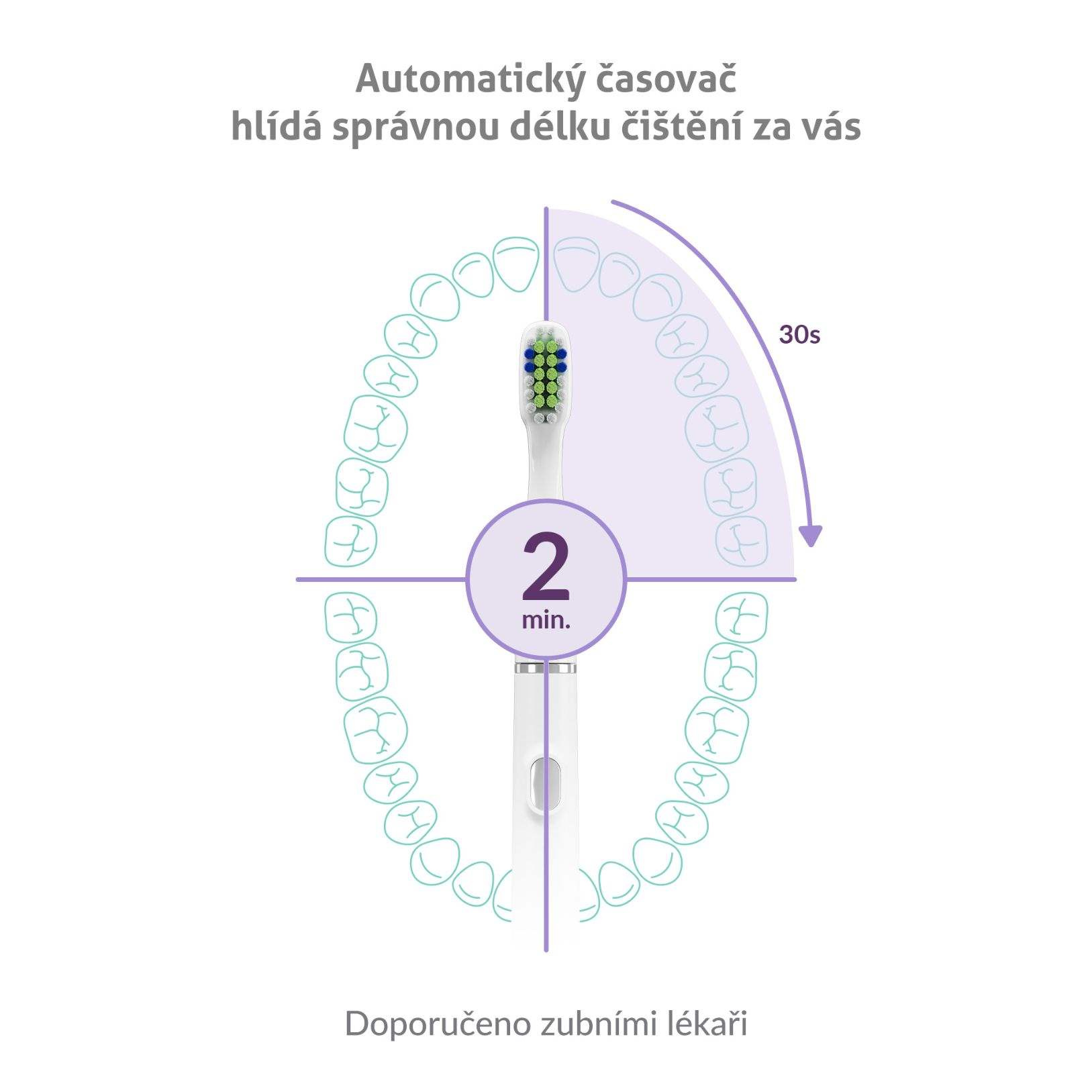 Nastavený 2minutový interval se dělí do čtyř 30vteřinových sekcí, kdy po každé z nich nastane krátká pauza upozorňující, že je čas přejít k čištění další části chrupu.
