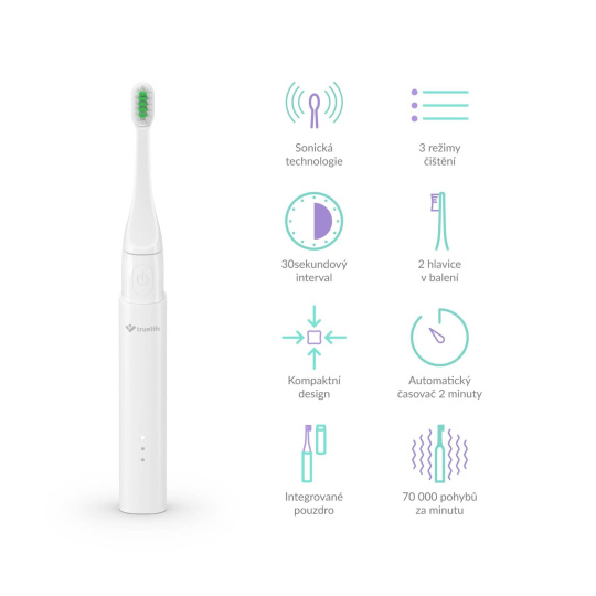 Chcete mít zdravé zuby a dásně? Na kartáček TrueLife s moderní sonickou technologií SonicTrue® se můžete spolehnout. Hlava kartáčku kmitá rychlostí 70 000 pohybů za minutu a každým pohybem odstraní maximum zubního plaku. Zároveň je sonická technologie šetrná k zubní sklovině. Praktické pouzdro je součástí těla kartáčku a baterie vám vydrží nabitá až 21 dní. Součástí balení jsou 2 hlavice Standard.