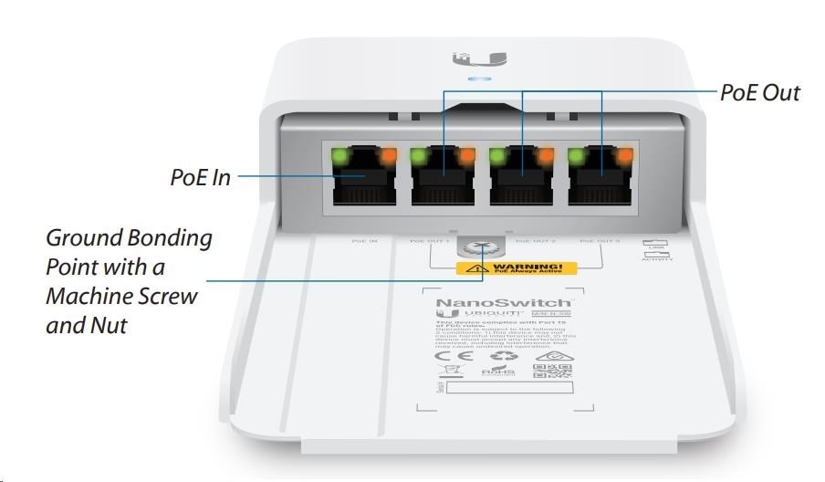 Switch má celkem 4 porty z čehož 1.port je určen pro vstupní napájení pomocí 24V pasivního Gigabitového napájecího PoE adaptéru s podporou napájení po 2 párech.