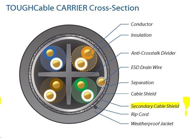 TOUGHCable CARRIER je speciálně designovaný stíněný SFTP kabel. Proti TOUGHCable PRO disponuje navíc kovovým opletením kolem hliníkové fólie podobně jako u koaxiálních kabelů pro SAT/TV techniku - zvyšuje odolnost vůči potenciálnímu rušení. Kabel kategorie Cat5e pro extrémní nasazení do nejnáročnějších meteorologických podmínek zásadně eliminuje rizika poškození venkovních aktivních prvků přepětím (ESD).