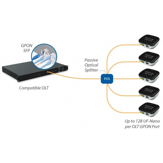 UF-NANO je kompaktní a zároveň robustně stavěný GPON koncový prvek s LED displejem pro zobrazení aktuální propustnosti / IP adresy a stavu ethernetu a optické linky. Rychlost PON linky je maximálně (Rx/Tx) 2.488 / 1.244Gbps, rychlost ethernetu je 10/100/1000Mbps a zařízení jako takové je možné napájet pouze přes 24V pasivní PoE adaptér. Zařízení jako takové slouží k převodu metaliky na optiku a umí pouze mód Bridge, nikoliv mód Router.