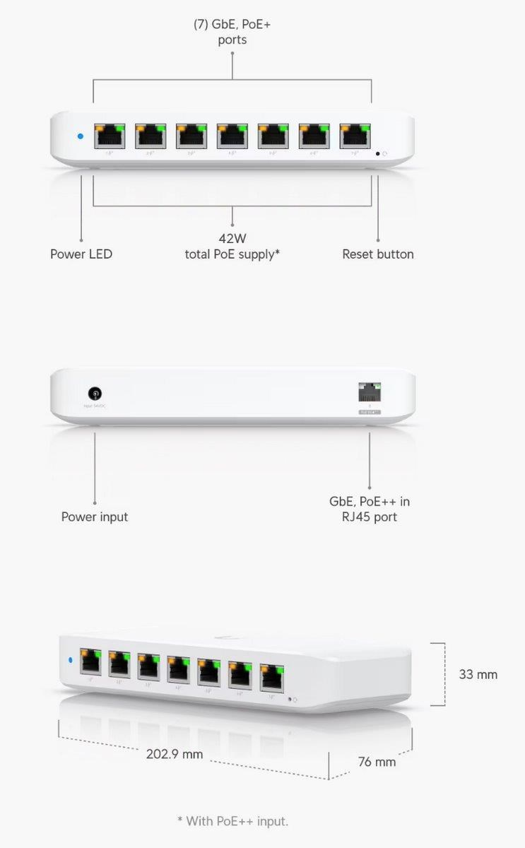 Popis produktu Kompaktní 8 portový gigabitový PoE switch. Switch disponuje 1 PoE in portem a 7 PoE out porty s podporou PoE napájení 802.3af/at s maximálním zatížením až 30W na port. Switch je spravován pomocí aplikace UniFi network umožňující centrální správu Vaší sítě včetně cloudového přístupu. Maximální PoE budget switche je závislý na způsobu napájení: • při napájení DC adaptérem 54V/3,9A (součástí balení) je PoE budget 52W • při napájení pasivním PoE adaptérem nebo 60W PoE++ adaptérem je PoE budget 45W Obsah balení • switch • napájecí adaptér 54V/3,9A • montážní set • Technické parametry • Konektory a rozhraní • Rychlost LAN:(8) 10/100/1000Mbps • Napájení • Typ napájení:DC konektor, PoE • Typy PoE:PoE-Out + PoE-In • Podporované PoE-Out standardy:802.3af, 802.3at • Počet PoE Out portů:7 • PoE budget [W]:52 • Max. spotřeba energie [W]:60 • Napájení přes konektor/svorkovnici:44 .. 57V DC • Fyzické charakteristiky • Provedení:Na zeď, Desktop • Ventilátory:Bez ventilátoru • Šasi:Plastové • Tlačítka:Reset • Provozní teplota [°C]:-15 až 45 • Šířka [mm]:203 • Výška [mm]:33 • Hloubka [mm]:76 • Obecné • Rychlost přepínání [Gbps]:8 • Software • Management:UniFi controller • Funkce:VLAN.