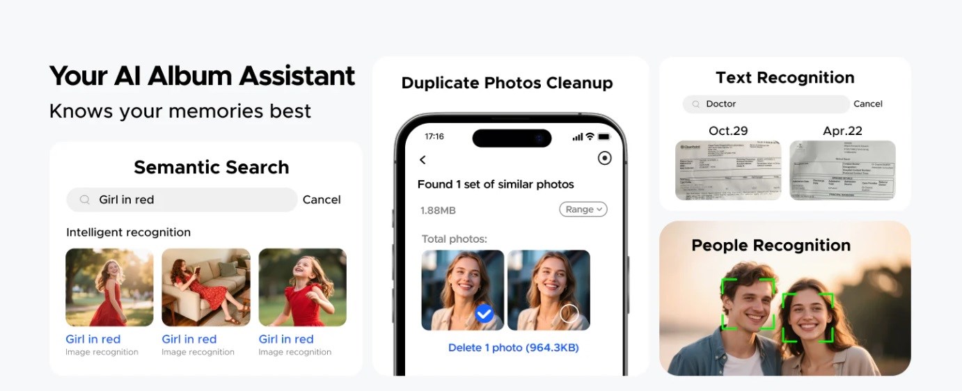 Fotografie podle tváří, scén a míst, odstraňuje duplikáty a vytváří personalizovaná alba růstu dítěte – bez námahy uchovává všechny vzácné okamžiky a umožňuje snadné sdílení s rodinou pomocí QR kódu nebo odkazu.