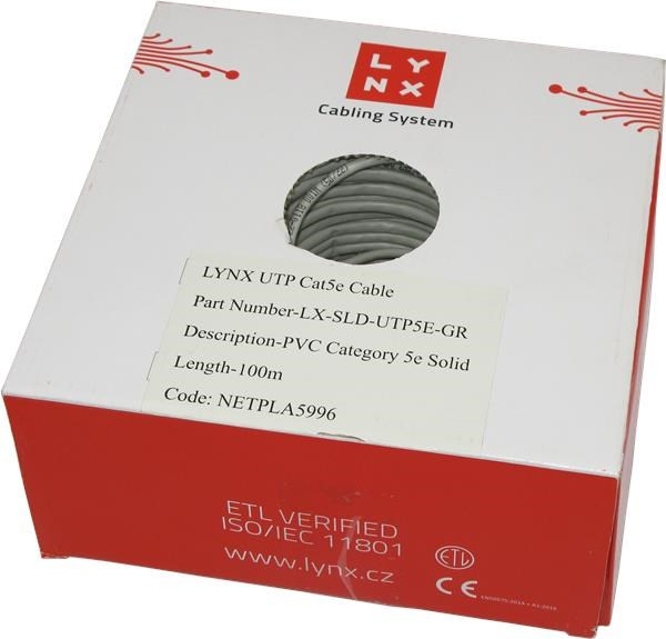 UTP kabel LYNX, Cat5E, drát, PVC, Dca, šedý, 100m