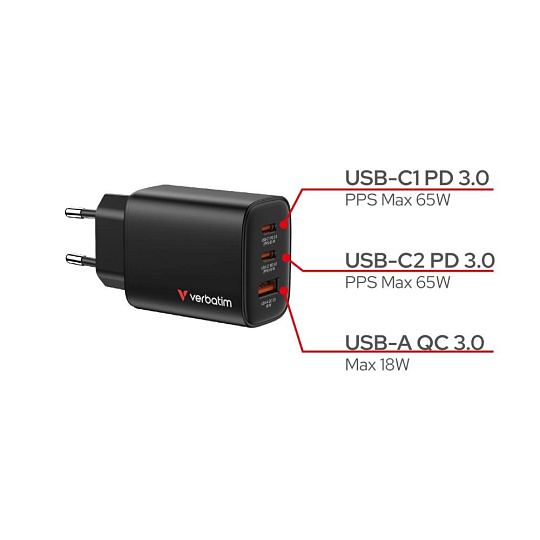 VERBATIM GaN Nabíječka Essentials 65W, 2xUSB-C, 1xUSB-A, černá