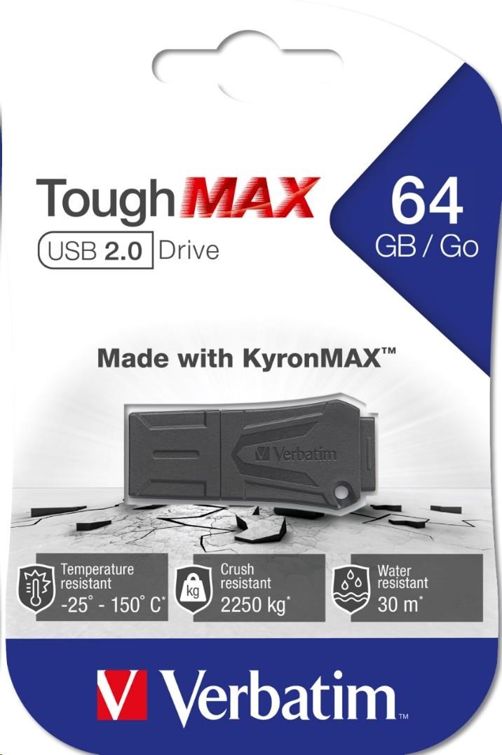 The Verbatim ToughMAX USB 2.0 Drive is made using KyronMAX™compounds, a metal replacement thermoplastic material which is able to withstand seriously punishing conditions and has been used in the most demanding of applications from fighter jets to mountain bikes.