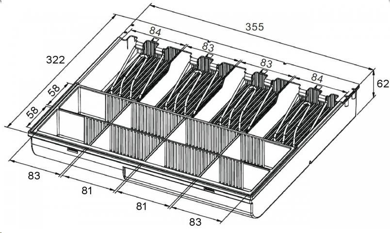 Slouží k ukládání mincí, dodatečně lze zakoupit nastavitelné přepážky pro zvýšení počtu přihrádek pro jednotlivé mince. Rozměry: 361 (Š) x 45 (V) x 125 (H) mm.
