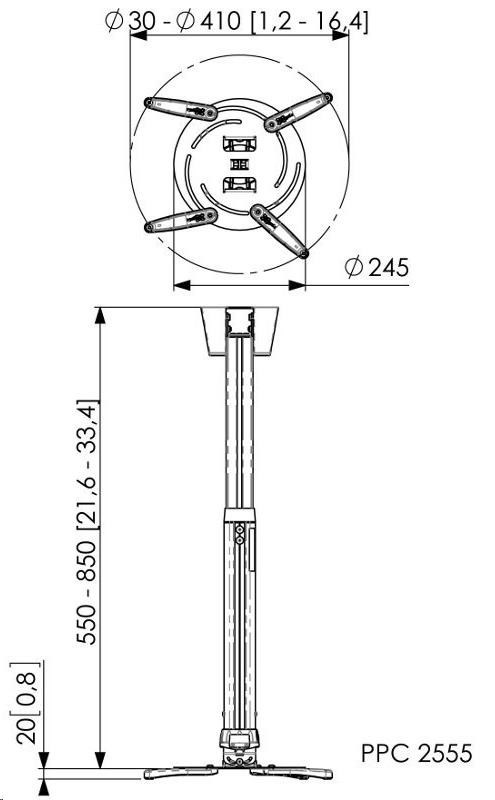 PPC 2555 Professional Teleskopický stropní držák na velký projektor 55-85 cm Teleskopický stropní držák na projektor do 30 kg ideální pro montáže, kde není přesně známa výška stropu nastavitelná výška 55-85 cm určen pro střední a velké projektory do 30 kg 4 nastavitelná montážní ramena s dosahem 30-410 mm možnost nákl... více