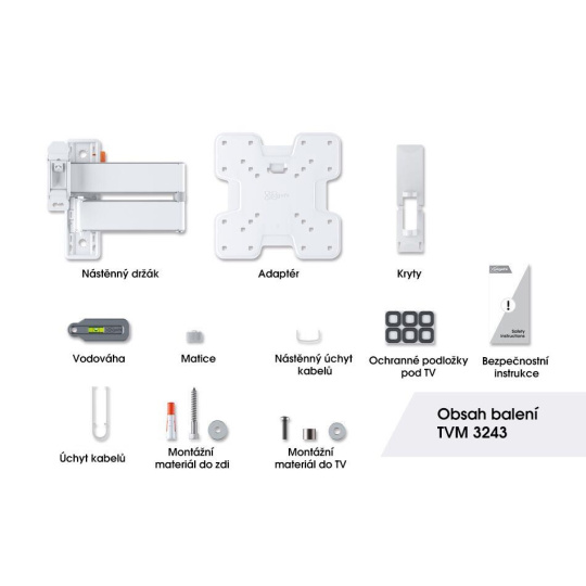 TVM 3243 je stylový nástěnný TV držák řady COMFORT Full-Motion+ a volíte s ním bezpečnost, design a optimální pohodlí při sledování. Držák je velmi robustní a vydrží intenzivní používání. Protože se může otáčet až o 180°, můžete si sledování TV vychutnat z jakéhokoli úhlu v místnosti. Naklápění je možné až do úhlu 20° (10° nahoru a dolů). TVM 3243 je vhodný pro televizory s úhlopříčkou od 19 do 43 palců a hmotností do 15 kg.