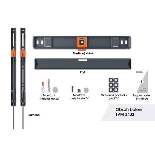 U nástěnného držáku TVM 3403 je bezpečnost na prvním místě. Držák je například vybaven bezpečnostním systémem ClickLoc™. Ten při montáži uzamkne televizor k držáku pomocí slyšitelného cvaknutí. Pro ochranu zadní strany televizoru při montáži je nástěnný držák vybaven měkkými podložkami. Držák je testován na 3x vyšší zátěž, než je jeho maximální nosnost.