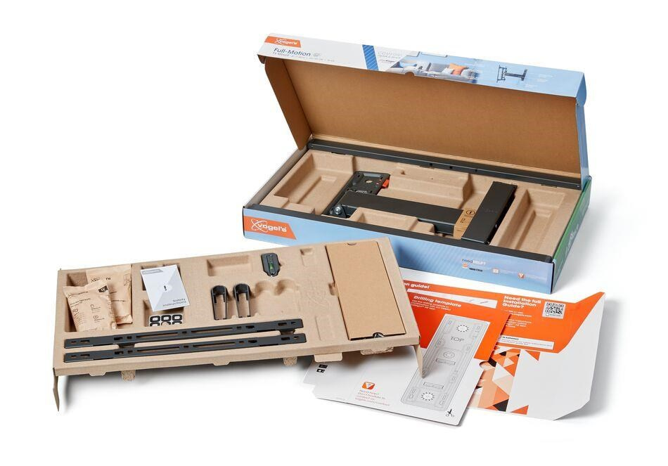 Instalace nástěnného držáku televizoru COMFORT Full-Motion není nijak složitá. Společnost Vogel's vám ji velmi usnadní. Součástí balení je vrtací šablona, šrouby, hmoždinky Fischer® DuoPower, stahovací páska na kabely a vodováha. Stačí označit první vrtací otvor pomocí naší bezplatné aplikace DrillRight™ AR a v rychlém průvodci instalací je krok za krokem vysvětleno, jak vše nainstalovat. Podrobný návod a speciální instalační video si můžete prohlédnout také online.