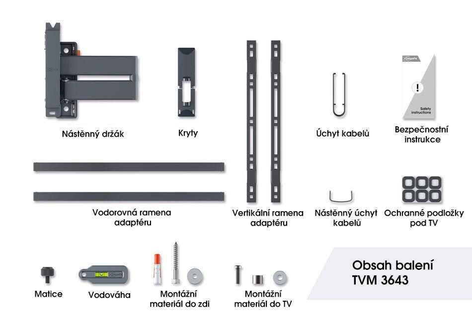 Pro bezpečné naklonění televizoru je nástěnný držák vybaven systémem TiltAnchor™, kterým můžete uzamknout naklánění TV. Měkké podložky na nástěnném držáku chrání zadní stranu televizoru před poškrábáním během jeho montáže. TVM 3643 se snadno instaluje. Součástí balení je vrtací šablona, šrouby, hmoždinky Fischer® DuoPower, stahovací pásky na kabely a vodováha. Jednoduše si vyznačte první vrtací otvor pomocí naší bezplatné aplikace DrillRight™ AR. Je váš televizor mírně nakřivo? Žádný problém. Můžete jej snadno vyrovnat, a to i po instalaci.