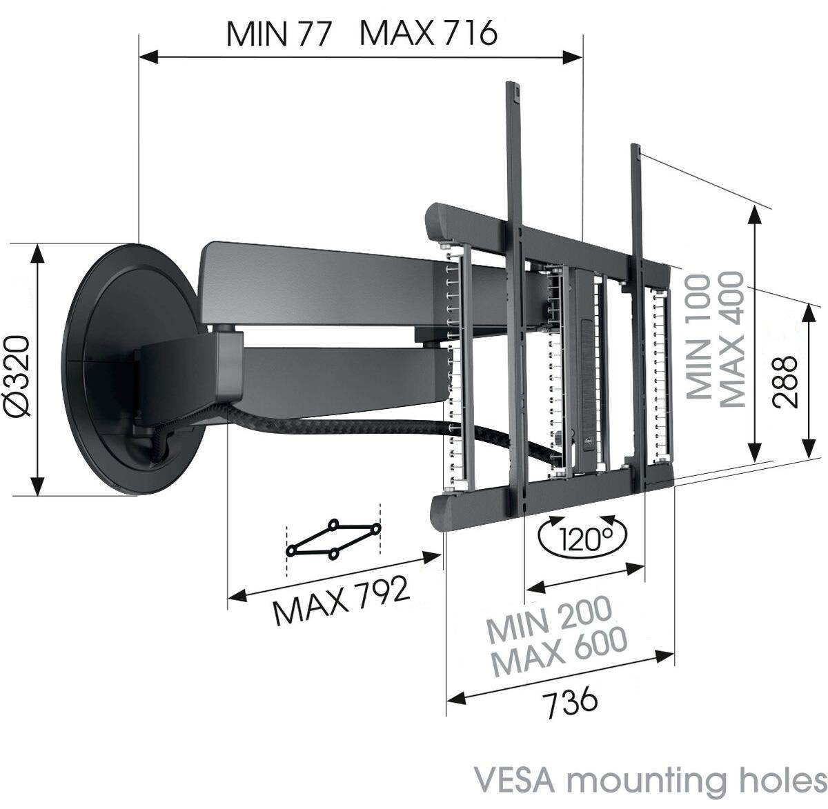 - Vzdálenost od stěny 77 - 716 mm