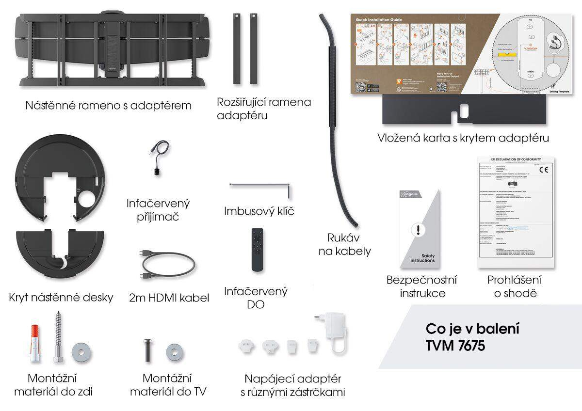 Systém vložení kabelů (CIS®) v nosných ramenech propojuje, chrání a skrývá kabely mezi stěnou a televizorem. Kromě toho je TVM 7675 vybaven integrovanými držáky kabelů. Ty umožňují uložit téměř 4 metry kabelů za televizor a udržet je úhledně mimo dohled za krycí deskou. Máte také možnost skrýt kabely ve zdi tak, že je protáhnete štěrbinou v nástěnné desce držáku. Součástí balení je kabel HDMI (2 metry), který umožňuje automatickou funkci držáku MotionMount při zapínání a vypínání televizoru. Kromě toho dodáváme v balení infračervené dálkové ovládání s přijímačem a můžete si stáhnout bezplatnou aplikaci MotionMount, která vám umožní ovládat držák prostřednictvím mobilního zařízení Apple nebo Android přes Bluetooth.