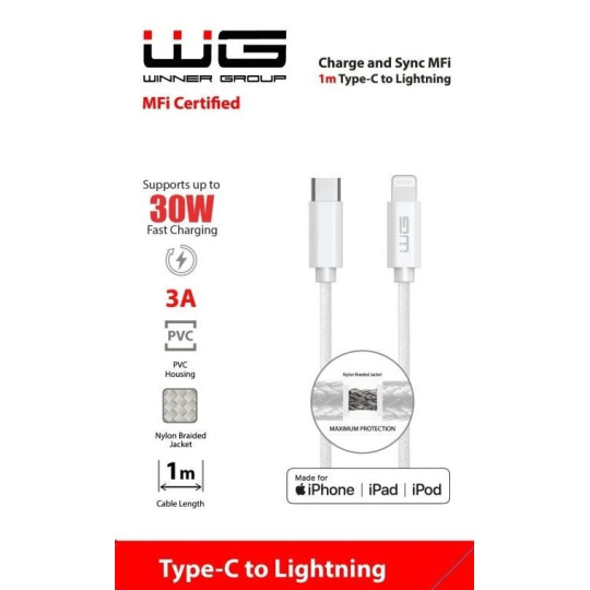 Prémiový kabel WG s certifikací MFi (Made for iPhone/iPad/iPod) je zárukou 100% kompatibility a bezpečnosti pro všechna zařízení Apple. Díky podpoře výkonu až 30 W umožňuje rychlé nabíjení iPhone, iPadu a iPodu a současně rychlý přenos dat bez zbytečného čekání.