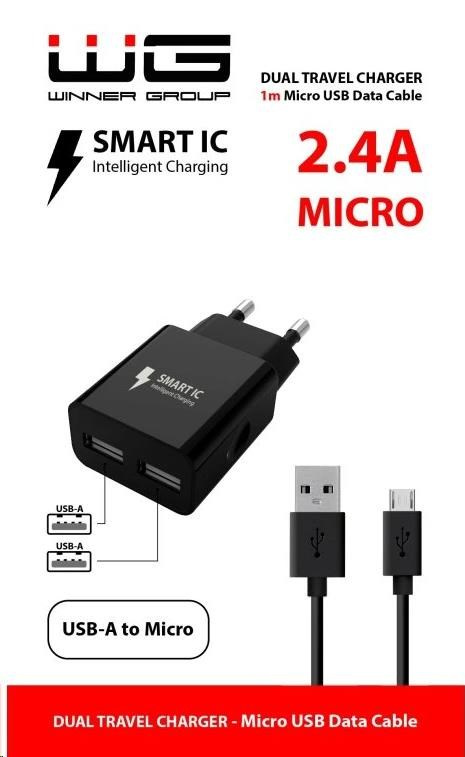 WG - Síťová nabíječka 2x USB-A 2,4A , Smart IC + kabel USB-A na Micro USB, black