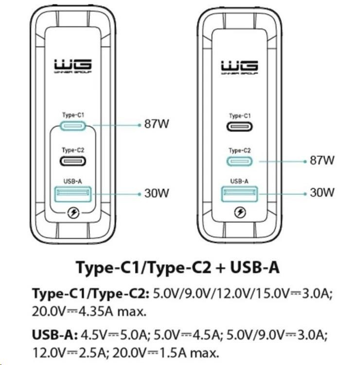 - USB-C1/C2 +USB-A: 5V/9V/12V/15V?3A, 20V?4.35A max (87W+30W)