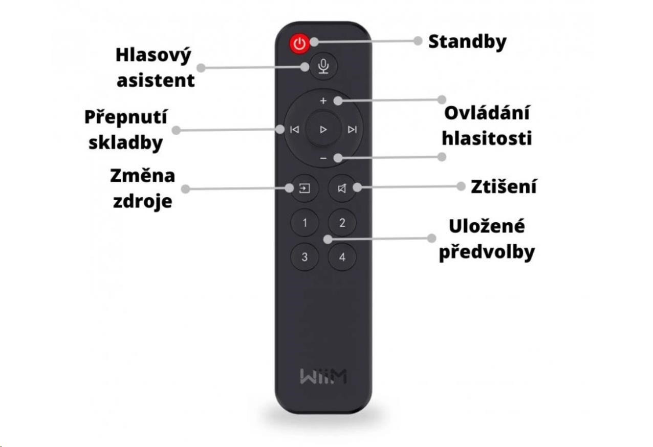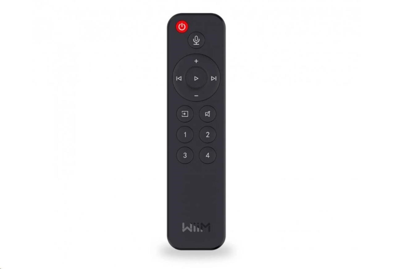 Dálkový ovladač pro Hi-Res audio streamery WiiM. Podpora funkcí: zap/vyp, ovládání hlasitosti, play /stop, posunutí skladby, přepnutí vstupu, mute, hlasový asistent, předvolby 1-4..