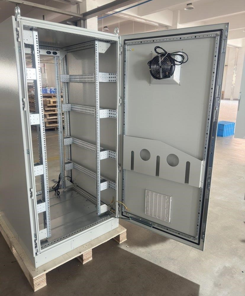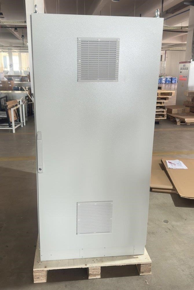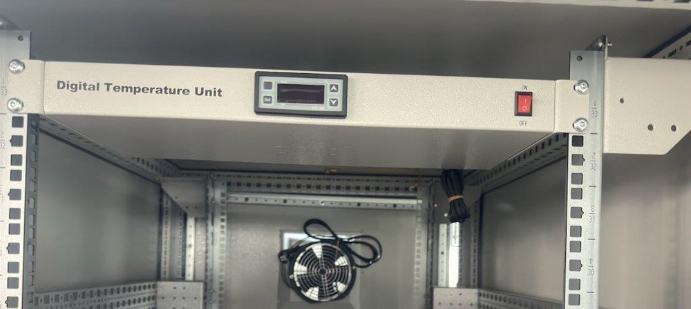 Rozvaděč pro instalaci datových a telekomunikačních zařízení, ventilace s termostatem, podstavec, šedý.